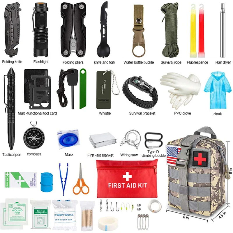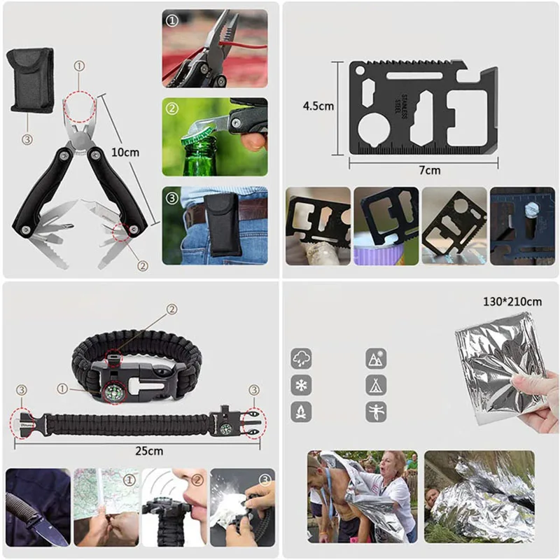 – Multi-Purpose Updated Tactics Kit.multi professional emergency survival kits. Containing: scraper, flashlight, mini light, updated compass, whistle, tungsten steel pen, emergency thermal steel, Wire saw etc.
