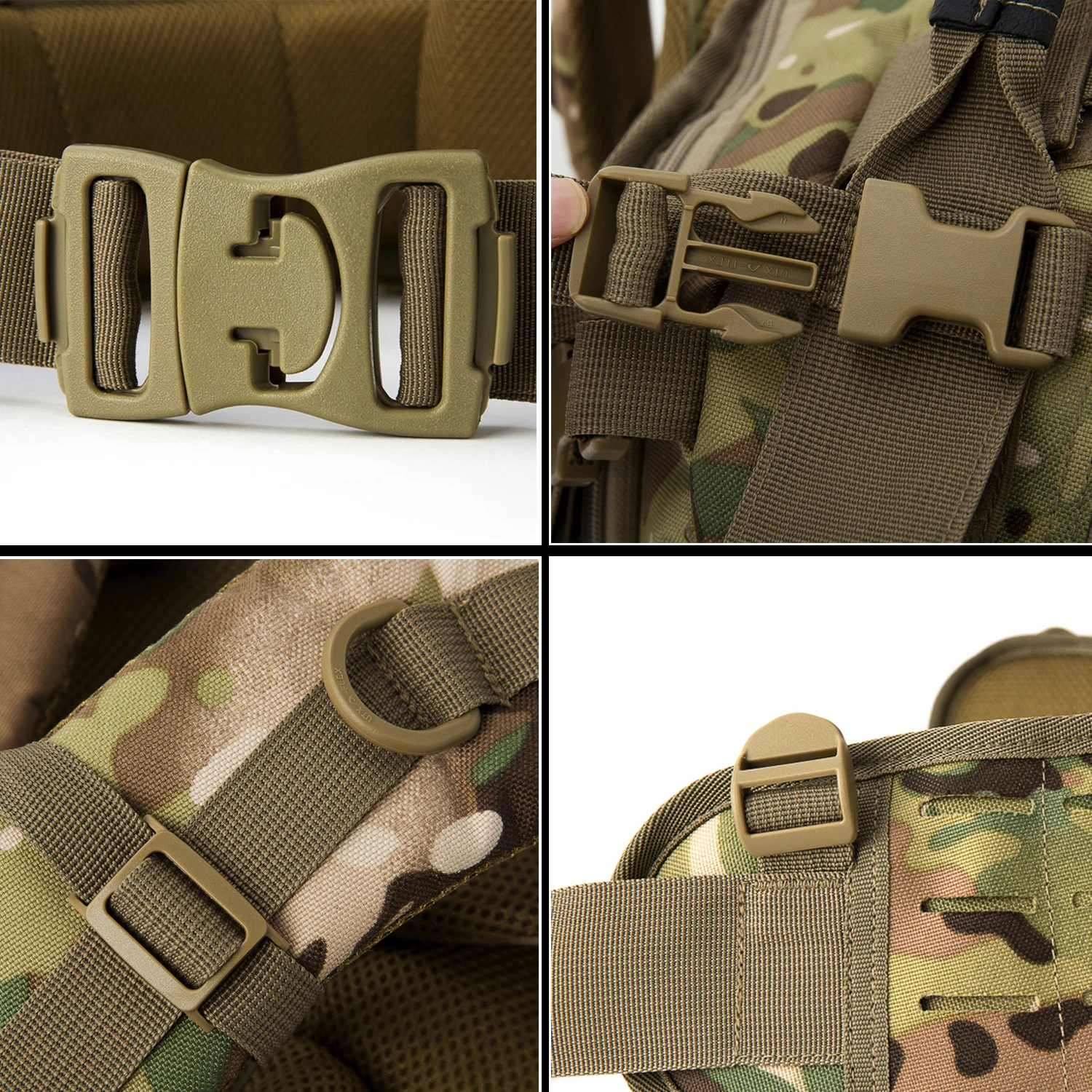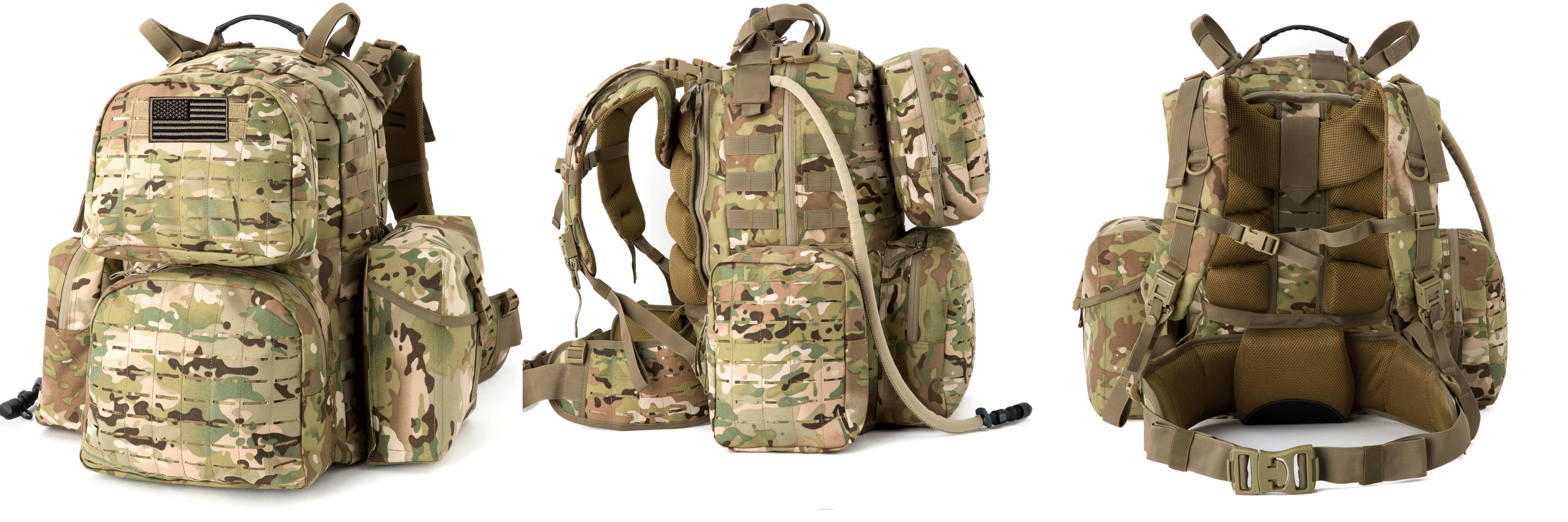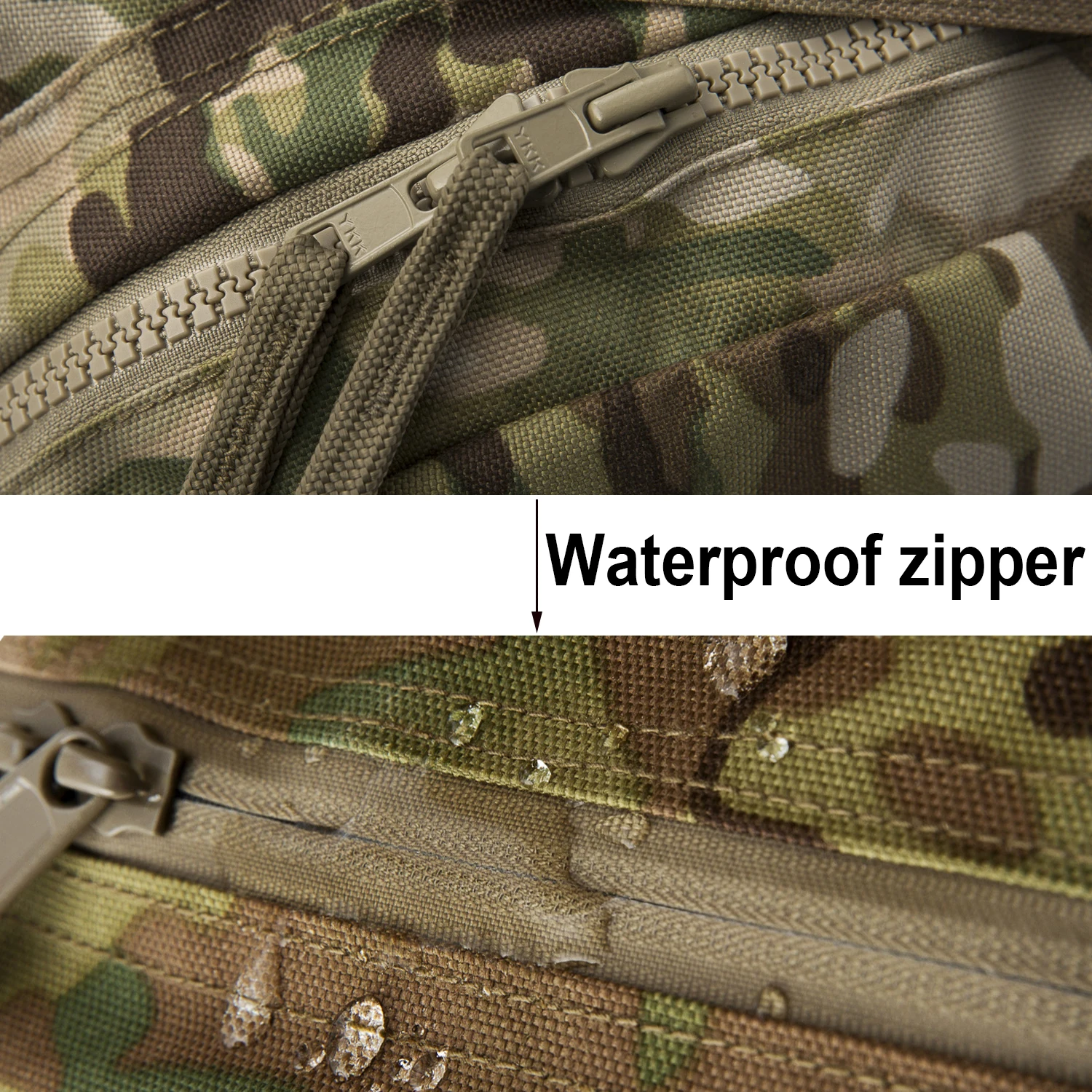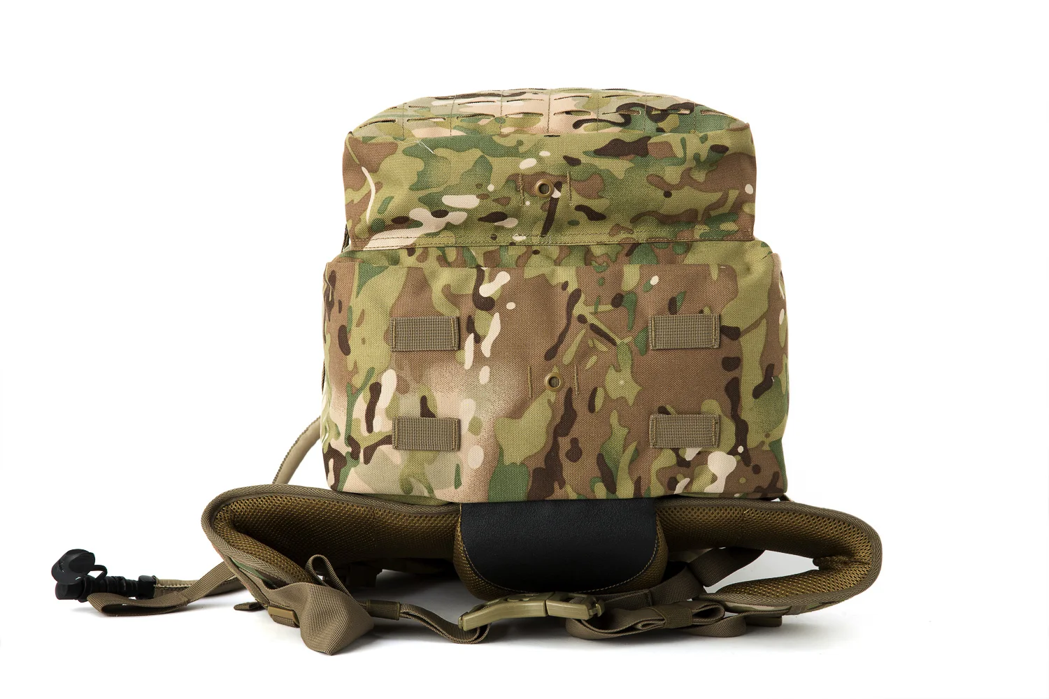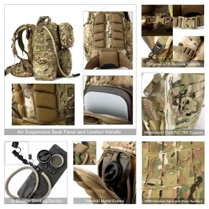 Military surplus design: Based on US army ranger MOLLE ii medium rucksack, use two layers fabric laser cutting PALS instead of webbing belt allow tactical pouches attachment. Rugged&high strength water-proof 1000D Oxford fabric, heave duty YYK zippers and original UTX buckles system are 100% adapted. Internal back board. Multicam camo mate well with army combat uniform(ACU).