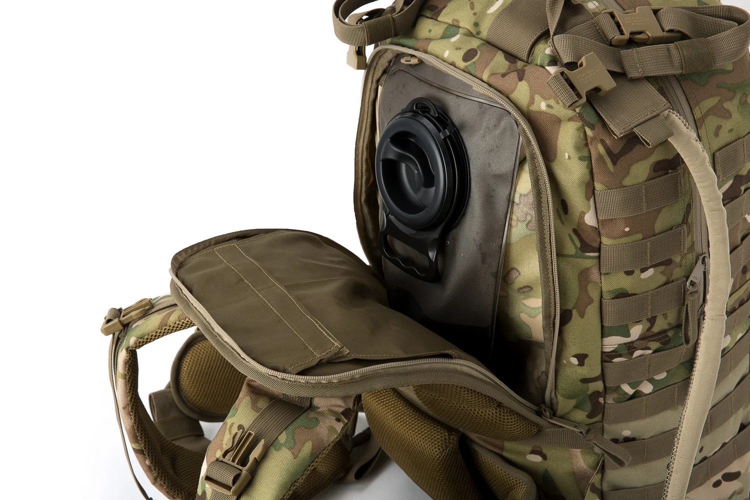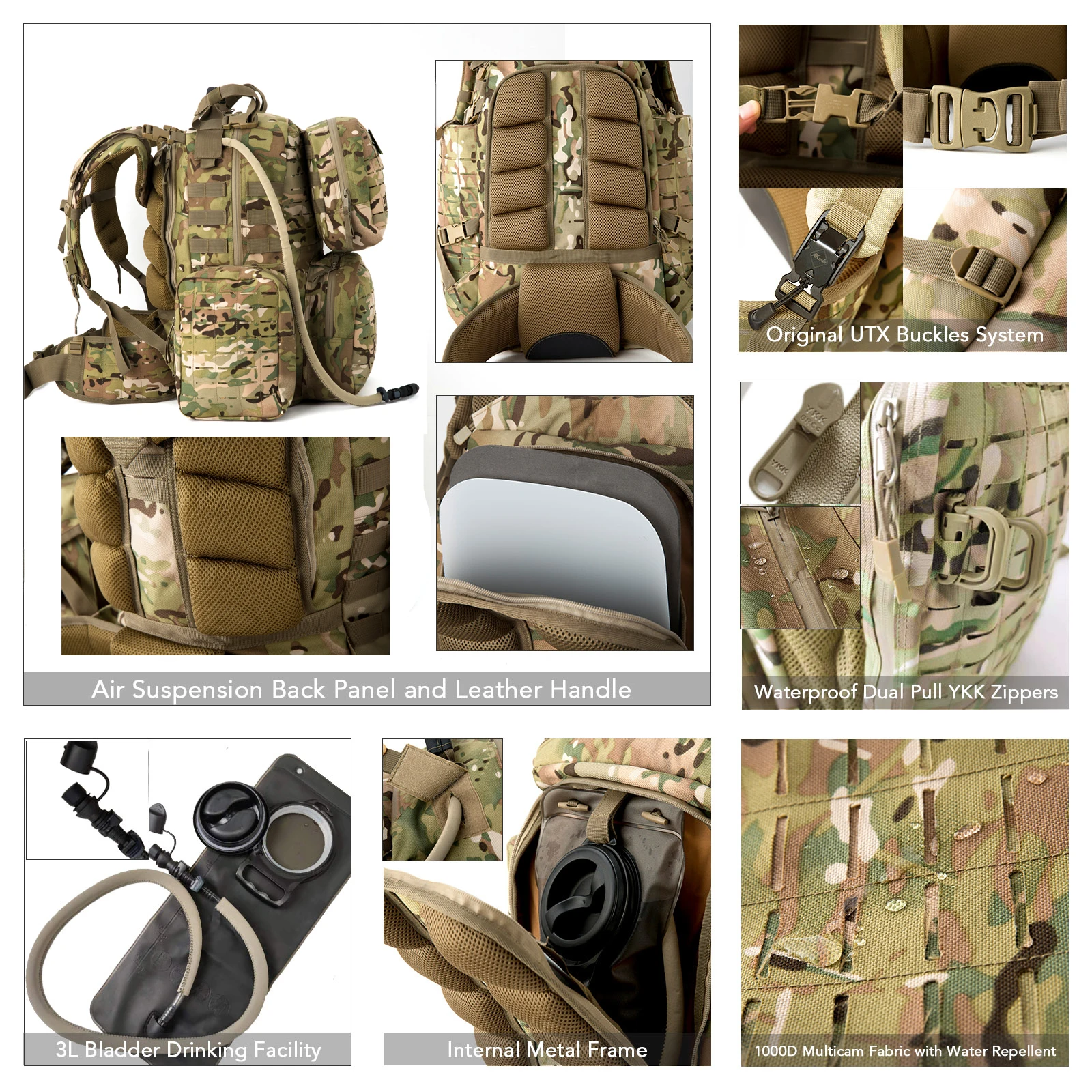 Space and Load: Main pack allows 55L storage space for daily supplies, detachable assault pouch is capable of being mounted onto bag’s upfront with flexible room. The sustainment IFAK pouch and day pack extend more space for bug out or camping necessary. A 3L hydration bladder locate in between main compartment and back panel provides water supplement while walking. It can hold up to Max 60 Lbs.