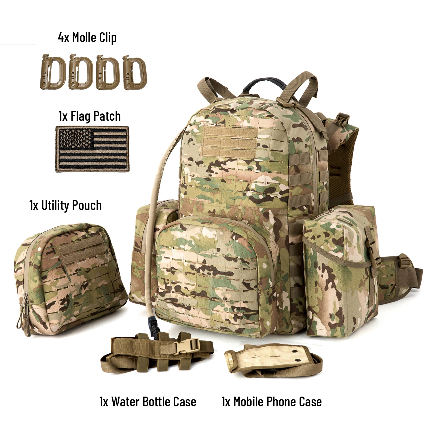 Ruck Component: Consist of 14 Detachable Parts, 1*Main Backpack, 1*Assault Pouch,1*Sustainment Day Pouch, 1*IFAK(Individual First Aid Kits) Pouch, 1* 3L Hydration Bladder System, 1*Drinking Case, 1* ID Case, 1*Padded Hip/Waist Belt. 1*Yoke Belt, 1 *US Flag Patch sticker, 4 x MOLLE D-Ring.