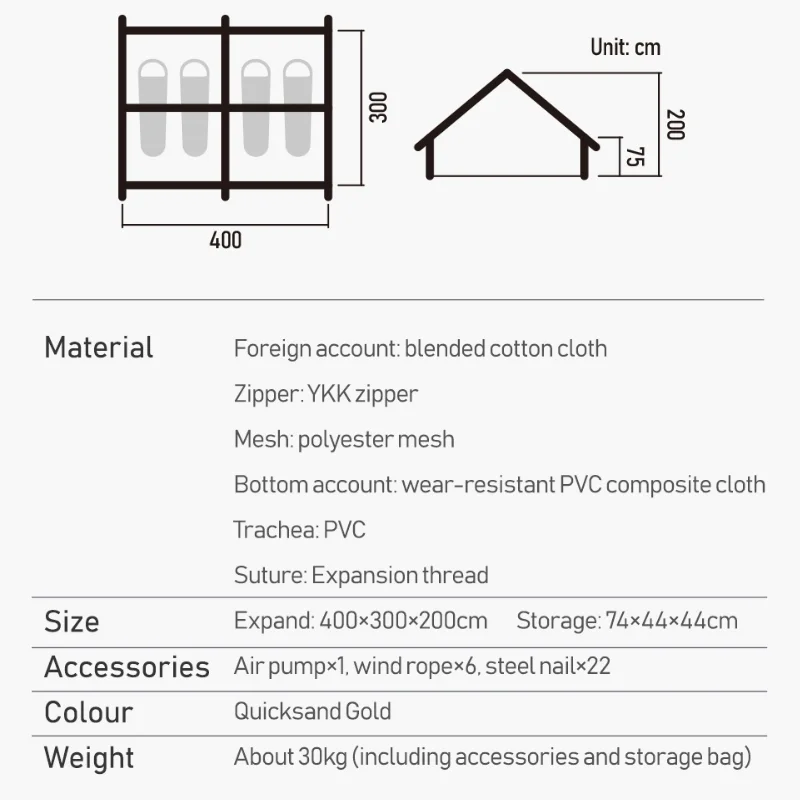 - Accessories: Tyre Pump*1 / Wind Rope*6 / Steel Nail*22 / Storage Bag