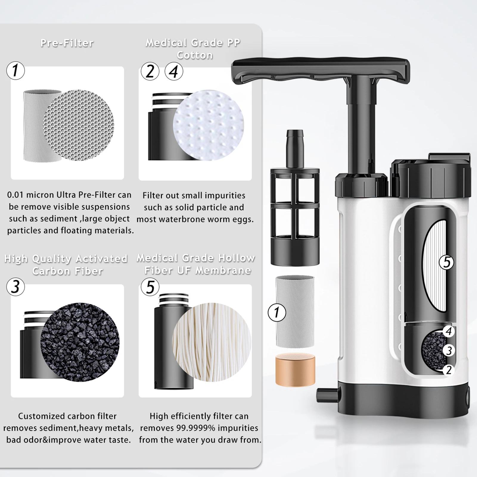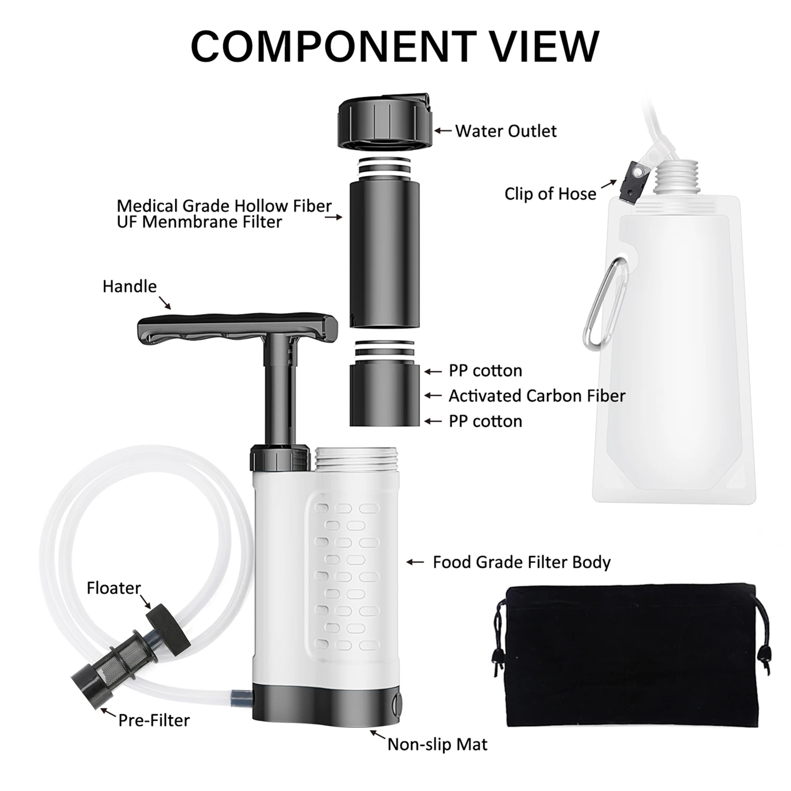 This water filtration system can effectively remove the bacteria in the water to provide clean, safe water. It is perfect for outdoor emergency, camping, hiking, backpacking, etc.